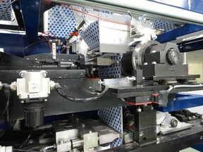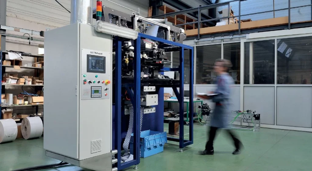 L’objectif de cette machine, développée à Sophia Antipolis, était de réaliser à la volée et à grande vitesse plusieurs opérations successives : coupe, remplissage puis soudure par ultrason d’emballages poches. Il s’agit de conditionnements pour les produits pâteux (type crème, shampoing, sauces…) de tailles allant de 40 mm x 60 mm à 80 mm x 200 mm.